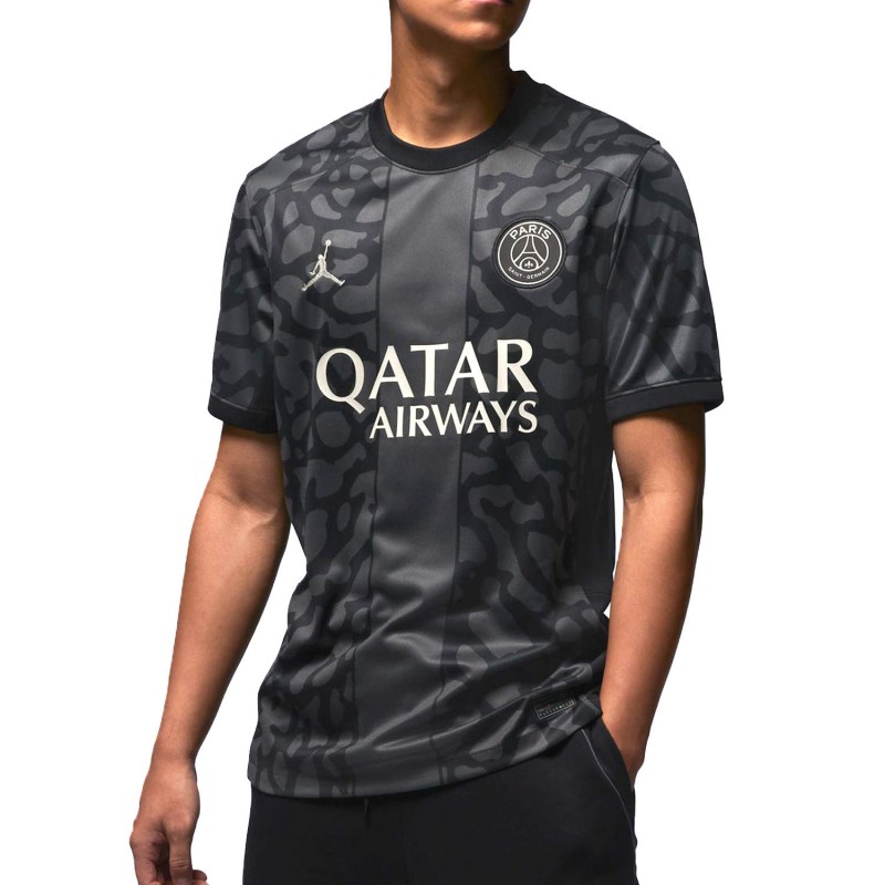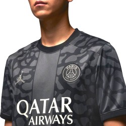 Tercera equipación Stadium del París Saint-Germain, diseño fabricado con la emblemática marca Jordan, el estampado de tipo camuflaje militar color negro y gris le aporta un estilo agresivo y llamativo.