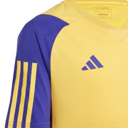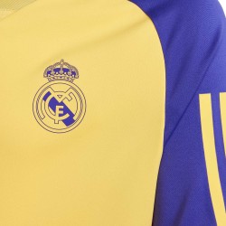 Vístete con la nueva equipación de entrenamiento del Real Madrid, diseñada en amarillo con el acompañamiento del lila que utilizaran en esta temporada 2023/24 en la competición Champions League.