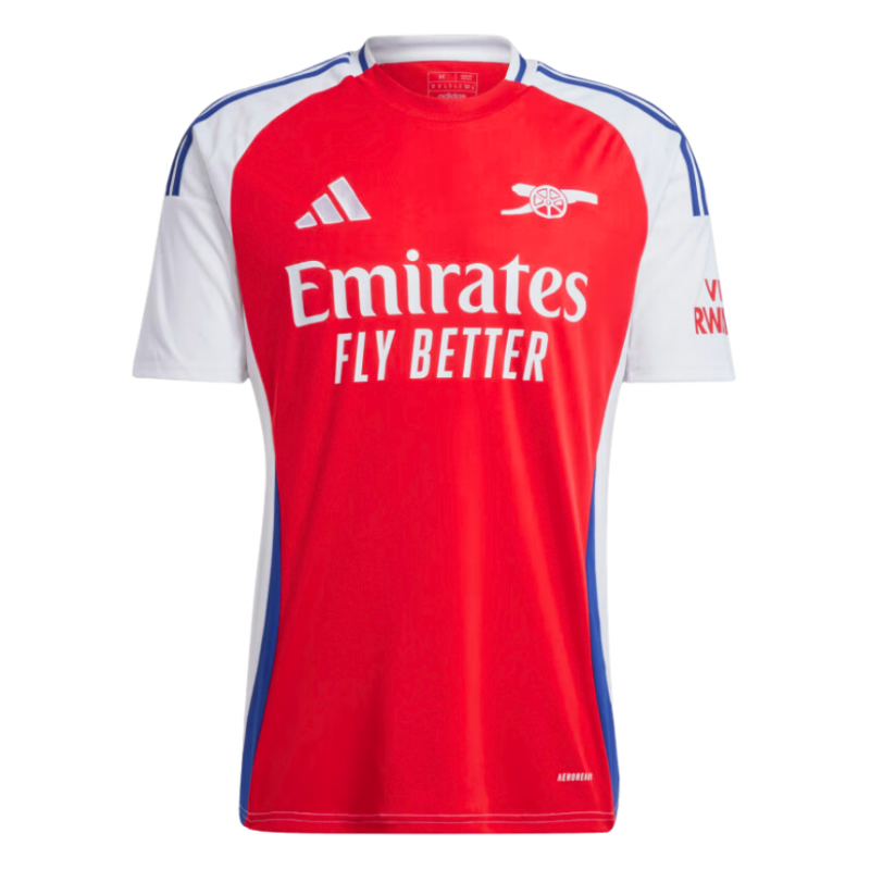 Primera equipación del Arsenal FC para la temporada 24/25, diseñada con los clásicos colores del club el rojo y el blanco, en esta ocasión con el acompañamiento del color azul marino en los detalles de la líneas de los hombros y laterales.