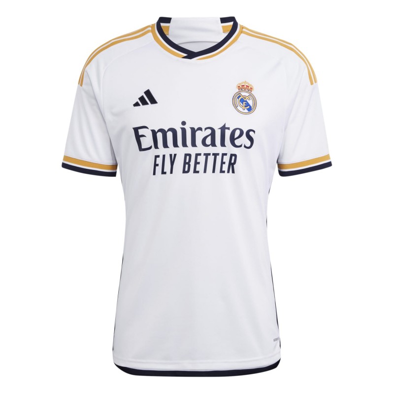 Para el Real Madrid la victoria es solo un pequeño paso para un objetivo aun mayor. Al igual que lo que el club representa, los madridistas llevaran esta camiseta con clase y elegancia. Con un color blanco clásico característico del club, detalles en los bordes en negro con dorado, y la inscripcion ¡Hala Madrid! en la nuca llevaras a tu equipo favorito con orgullo.