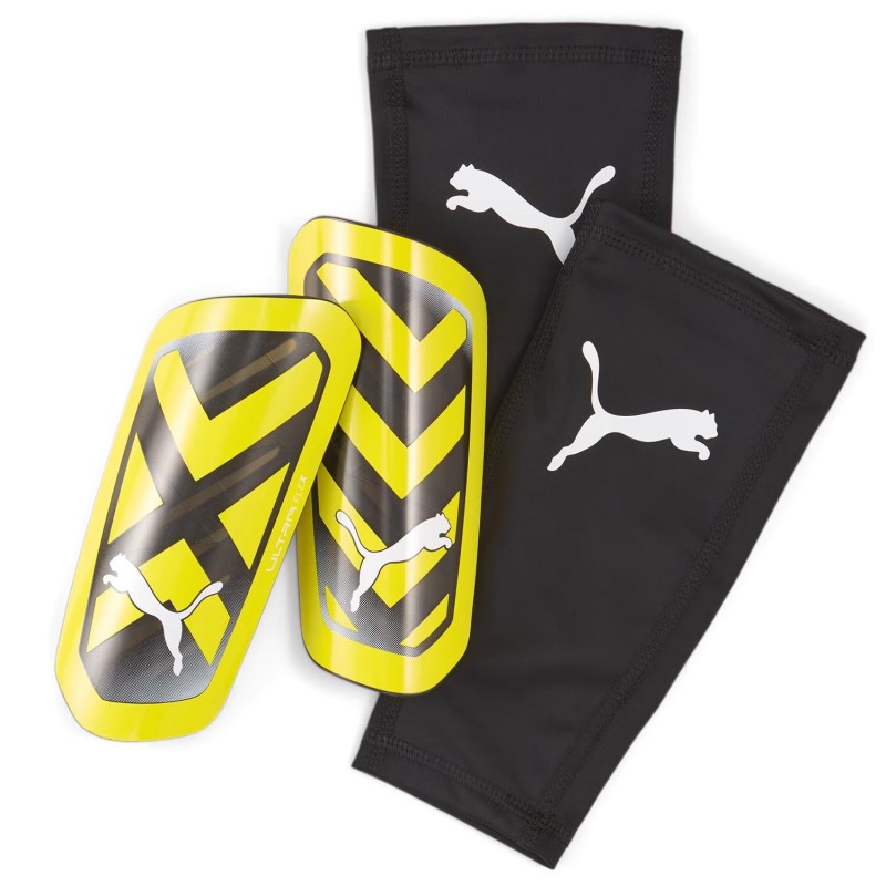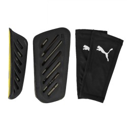 Espinilleras de fútbol Puma Pro con funda de sujeción para mayor comodidad y alojamiento en la funda para que la espinillera no toque la pierna directamente. Diseño ligero para que la sensación de que las llevas sea casi imperceptible, ademas de ofrecer una gran protección gracias a la coraza dura y la tecnología EVA de su interior que crea una gran amortiguación de cada impacto.