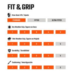 Corte de estilo FingerTip Negativo que otorga un gran ajuste en toda la mano y una optima ventilación, además, en las zonas de impacto incluye incrustaciones de goma colocadas estratégicamente para mitigar el impacto y potenciar el despeje de puños. Zona de cierre ceñido a la muñeca.