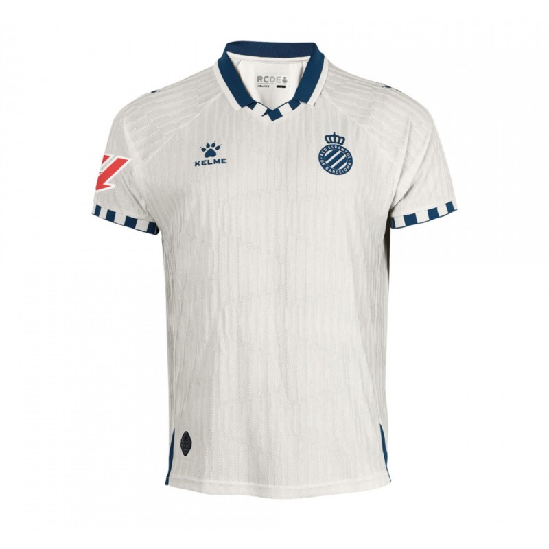 La 2a equipación del RCD Espanyol para la temporada 2025/26 destaca por su elegante diseño monocromático en tono blanco crudo, que combina tradición y modernidad. Diseñada por Kelme, ofrece una imagen limpia y estilizada, ideal tanto para los días de partido como para el uso urbano.