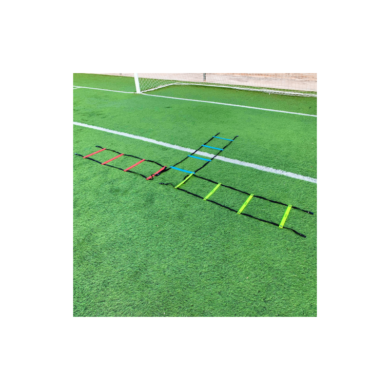Escalera pensada principalmente para realizar ejercicios de coordinacion y velocidad en porteros, este diseño en forma de "T" ayuda en la concentracion y equilibrio a la hora de realizar los ejercicios. Cada escalera contiene 2.4 M de longitud con 4 peldaños fijos para realizar los ejercicios.